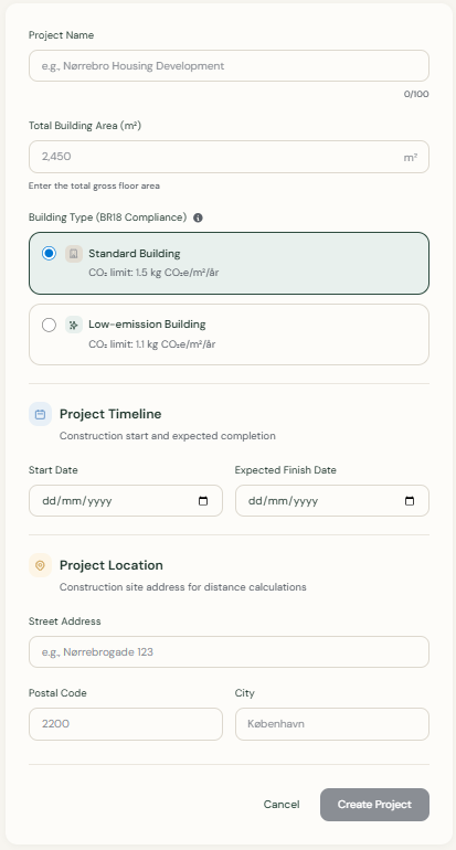 | Actual transport distance | The real distance from producer to your construction site (km) — used to scale the EPD value |