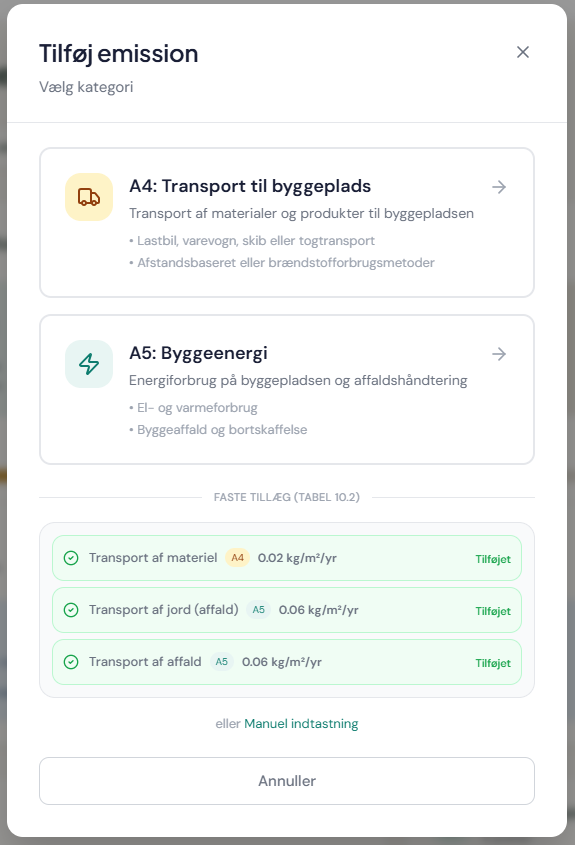 | Terminal processes | Automatic | Storage and reloading of materials. Added automatically (+0.02 kg CO₂e/m²/year) when A4 transport is recorded |
